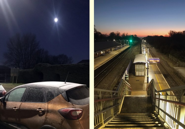 Up betimes, as Samuel Pepys would put it, and out for a morning near Henley-in-Arden. Frost glinted off the moonlight at the bus stop (-4°C), and I descended the station stairs with a view of London’s sunrise-to-come. A total of one hour waiting at stations in the 2.5-hour span, and I emerged at Warwick Parkway, after a journey in pale winter sunlight (except for the fog which shrouded Bicester and its environs) to a white frosted land. My lift took me to the start (and back from the finish) of the circular walk.