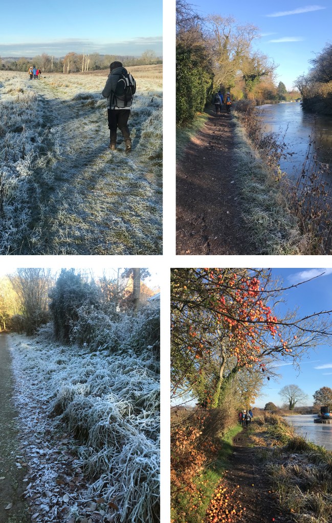 After consuming mince pies, we set off across the crunchy white field, and descended to the towpath of the frozen Stratford-upon-Avon Canal. The temperature was still below zero, but we were warming up inside our layers, and even gloves were now optional. The last of the leaves were falling onto the ice on the canal, and there was a massive windfall from a crab-apple tree. At the end of our canal section, we had a short refuelling break.