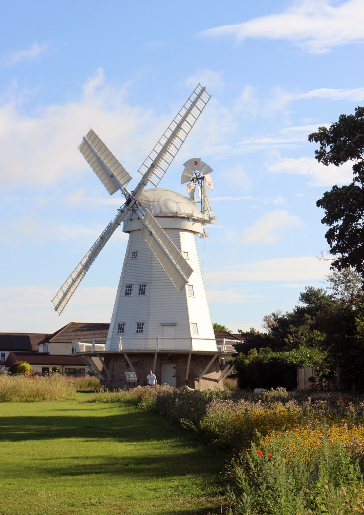 I walked the route from east to west, so that the sun was generally behind me on my morning outings (as early as I could by public transport from the western edge of London, where the buses don’t kick in until half the morning has gone — just after 0600). Leaving behind the architecturally null main entrance to Upminster station, I soon reached Upminster Windmill (pictured). As a friend remarked on seeing the sails, “Musk certainly gets around”.