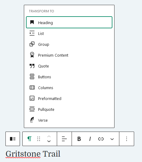 - In the block-type search box, type a targeted part of the block-name (e.g., grit for the Gritstone Trail).